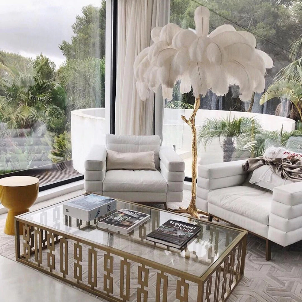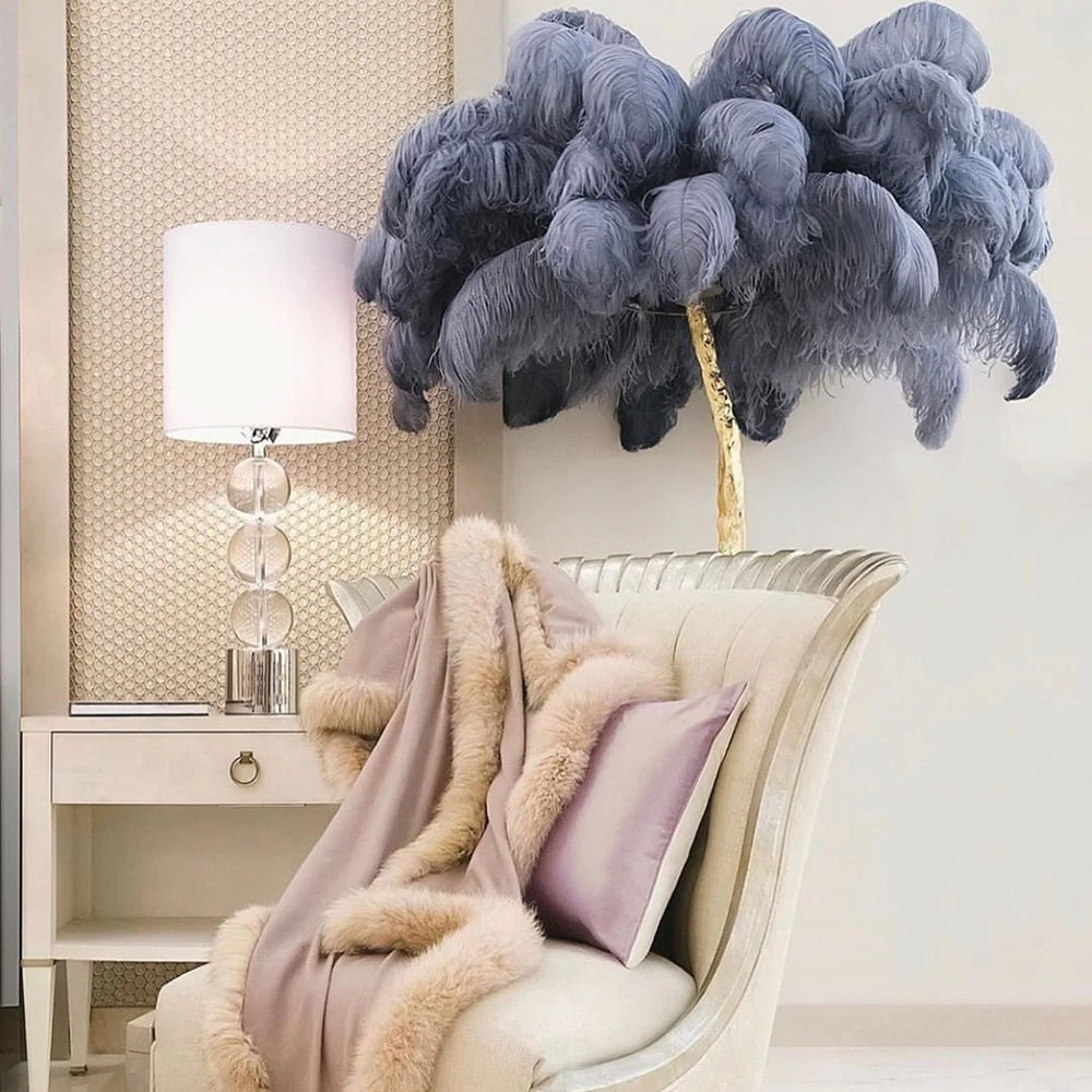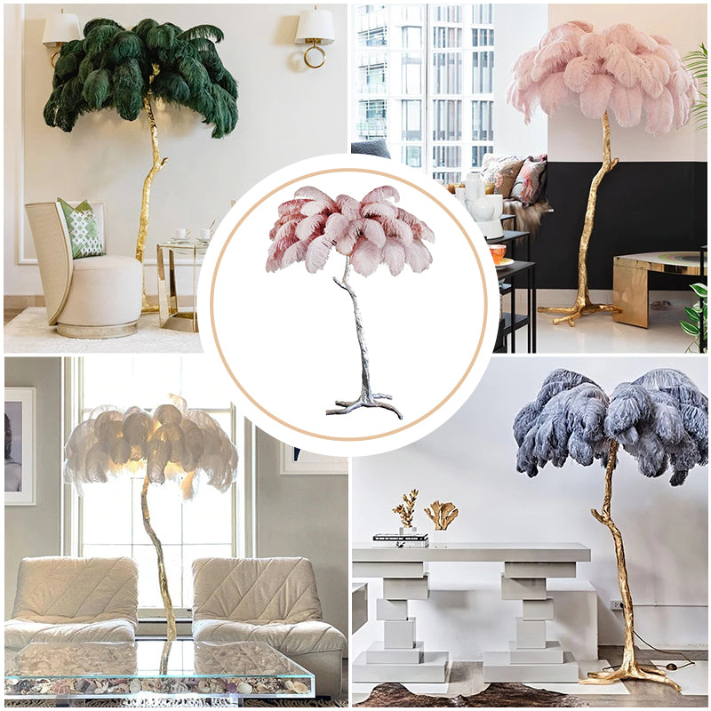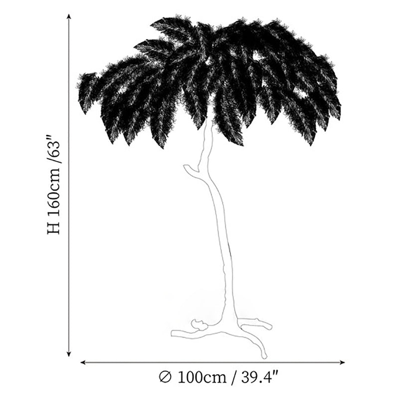 • Decorate your room and complete it with a tropical-inspired tree shape Palmera floor and table lamp. The body is masterfully shaped to imitate the palm tree, and decorated with leaf-like ostrich feathers on top to create tropical motives in your space.
