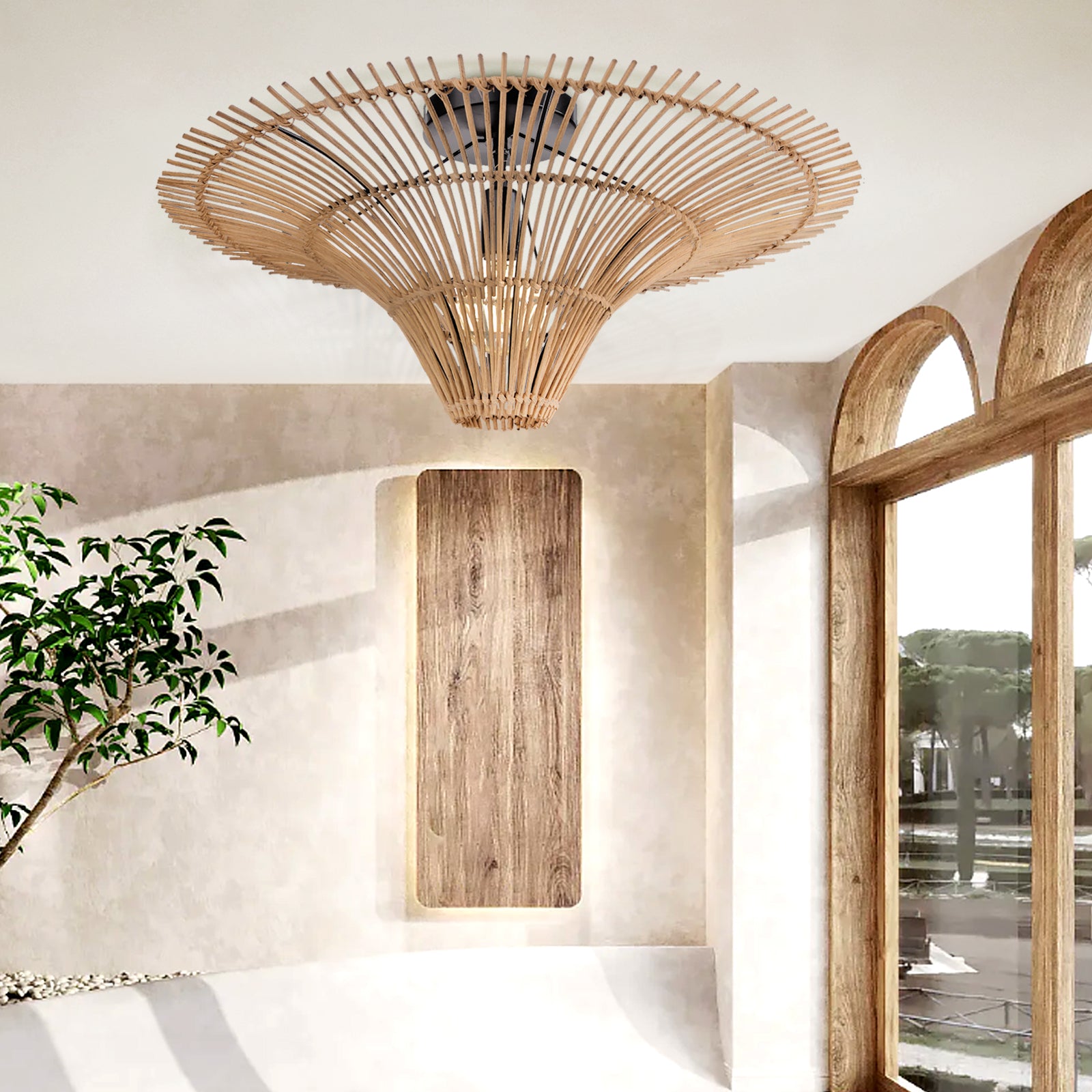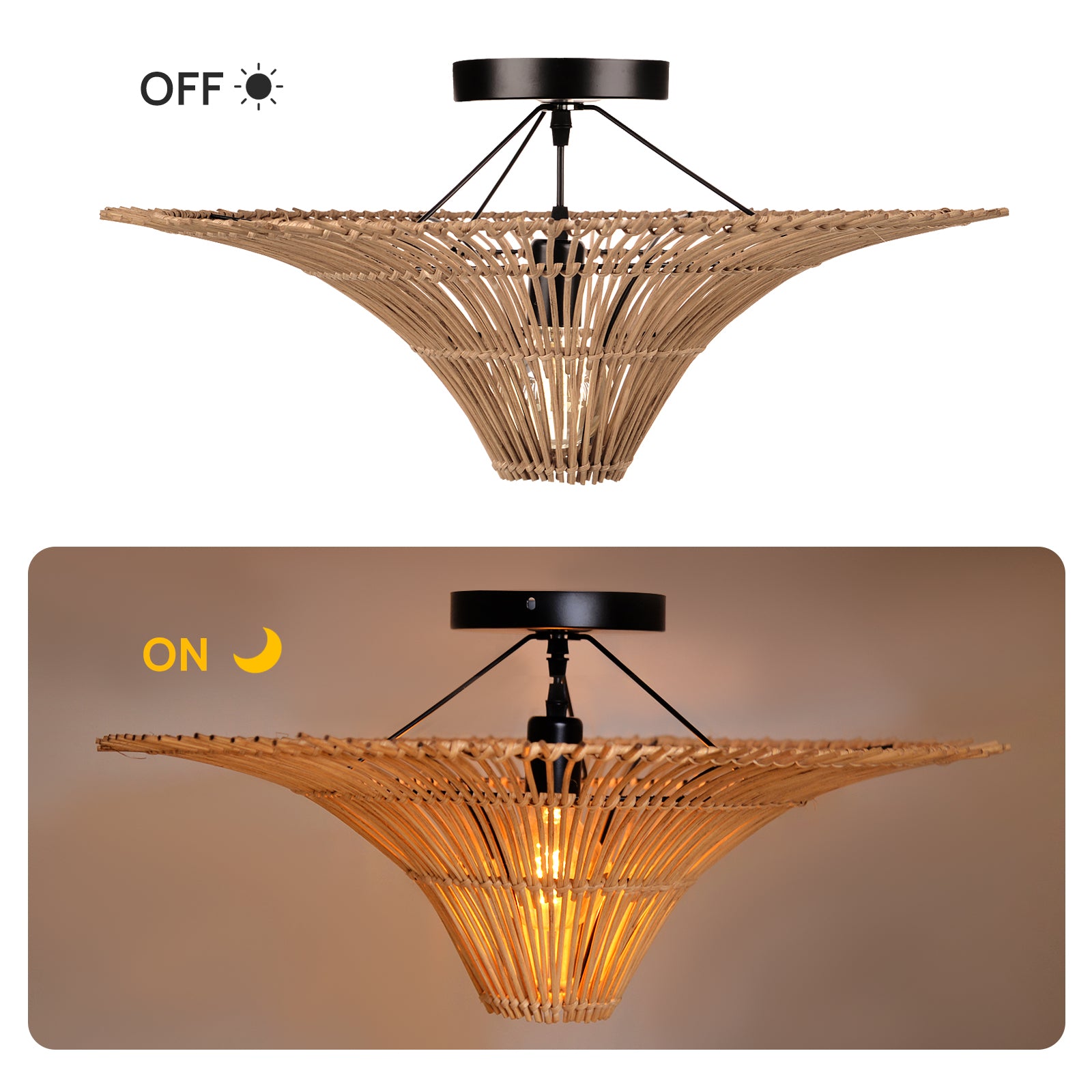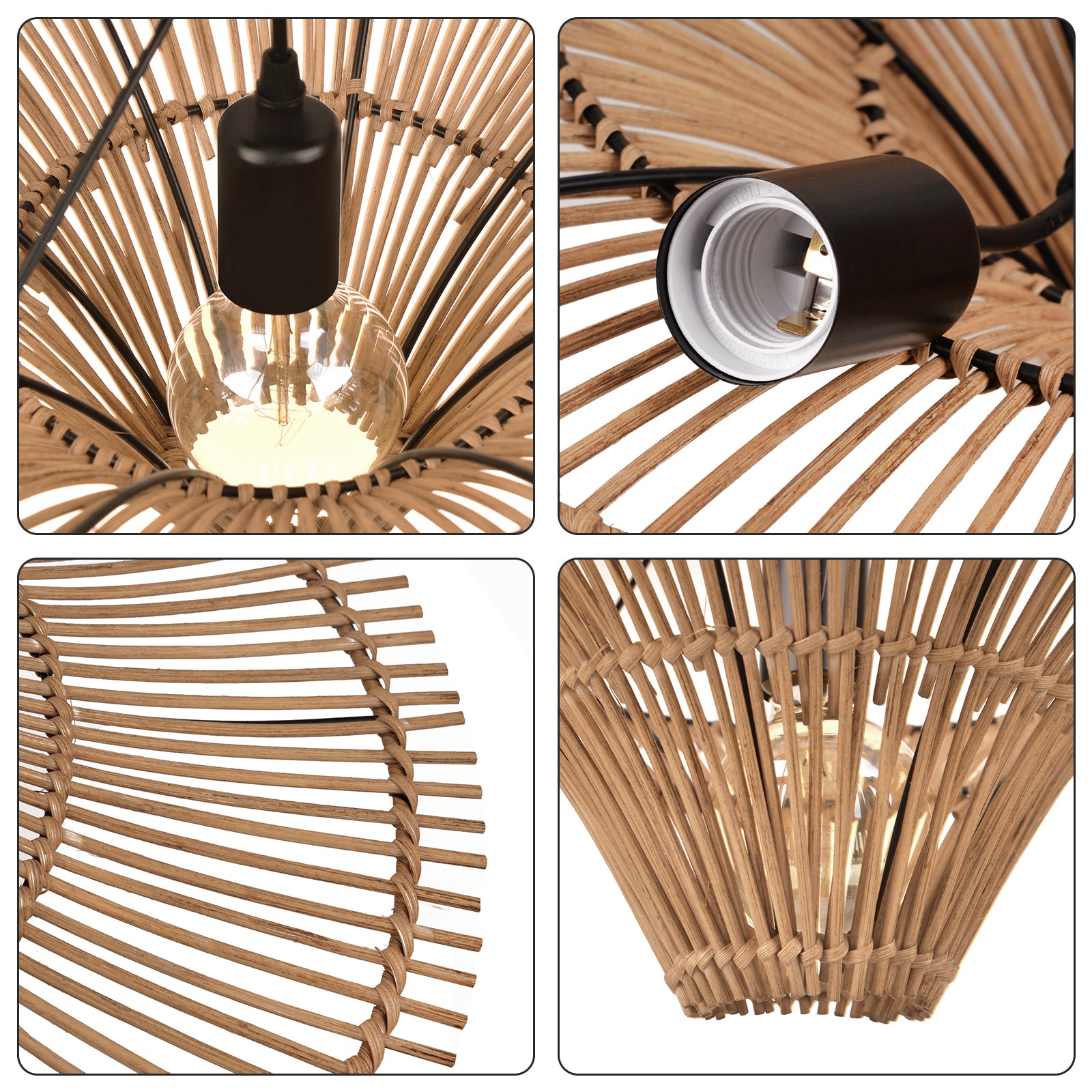- Featuring a mid-century inspired silhouette and coastal style, this oversized rattan pendant lamp is made from natural rattan with a strong internal metal frame. Durable and well-structured, it is perfect for indoor lighting, sheltered outdoor spaces, and—depending on the design—fully exposed outdoor environments.