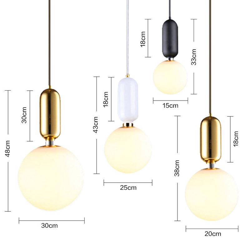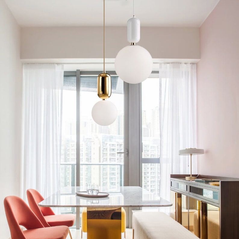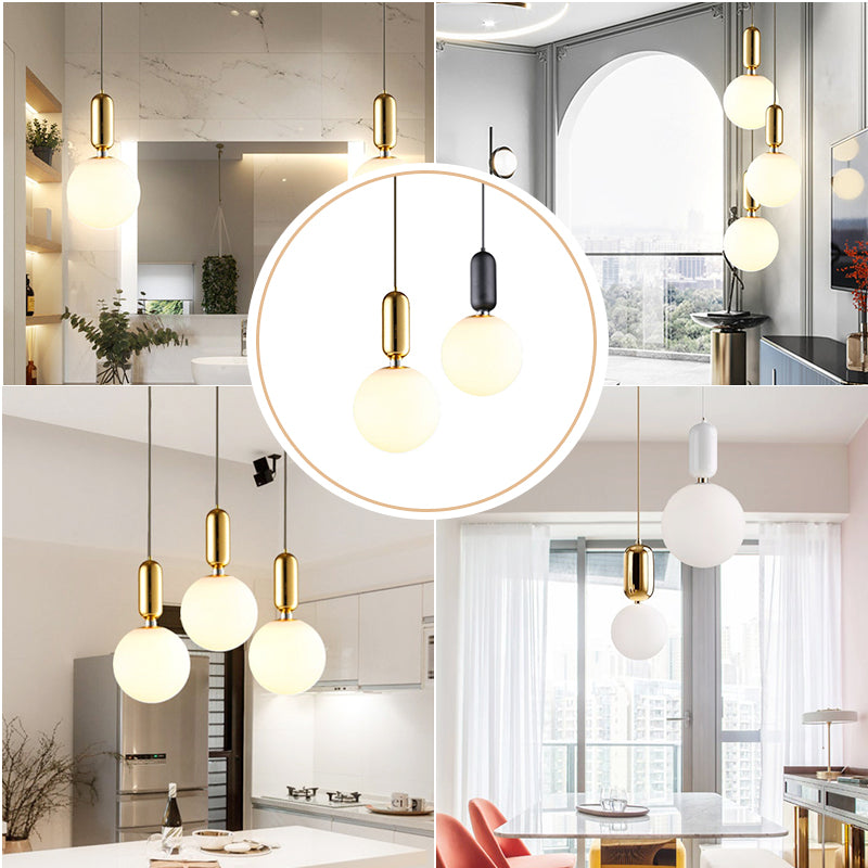 • The smooth white globe hangs delicately from the ceiling and is accented by a matte brass or black cylinder detail.