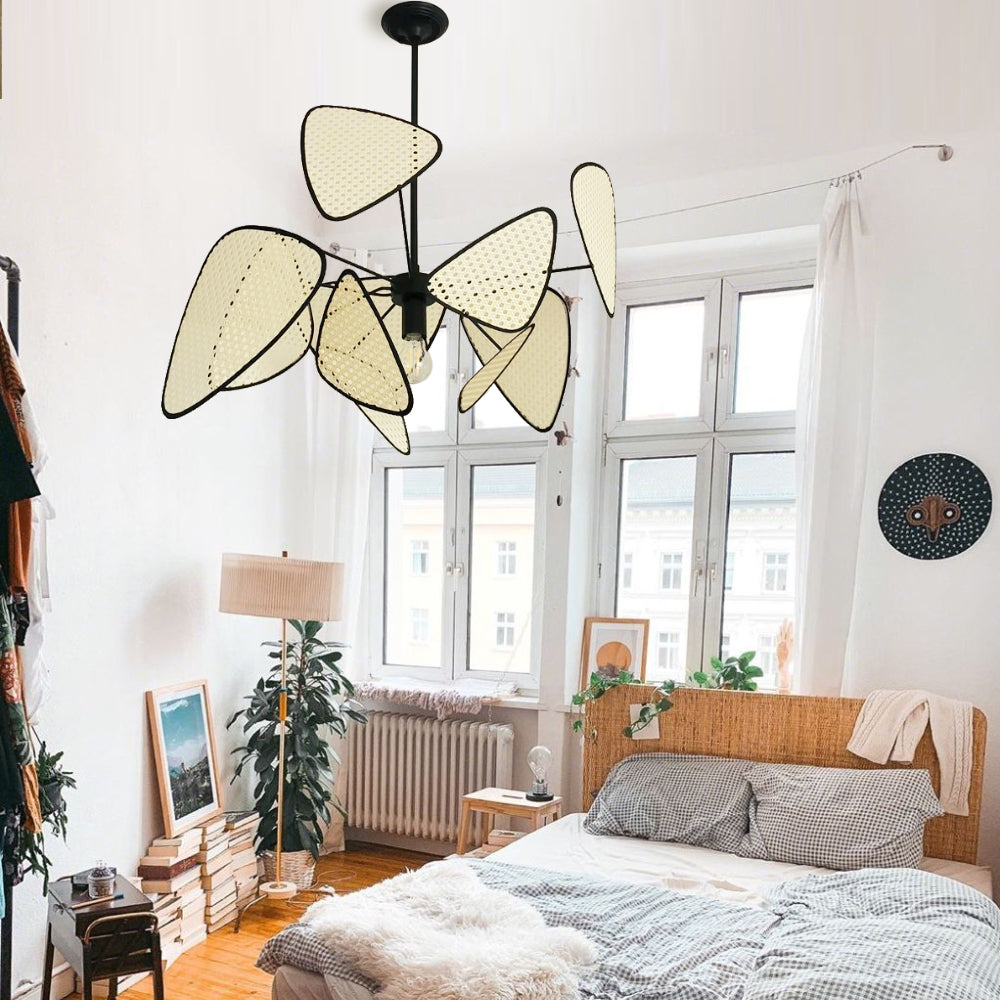 Designed with sculptural, leaf-inspired woven panels, this chandelier blends natural rattan texture with a clean black metal frame, creating a light and airy visual statement.