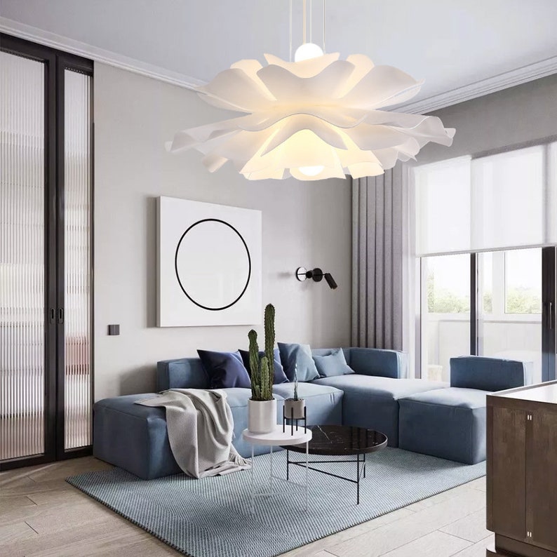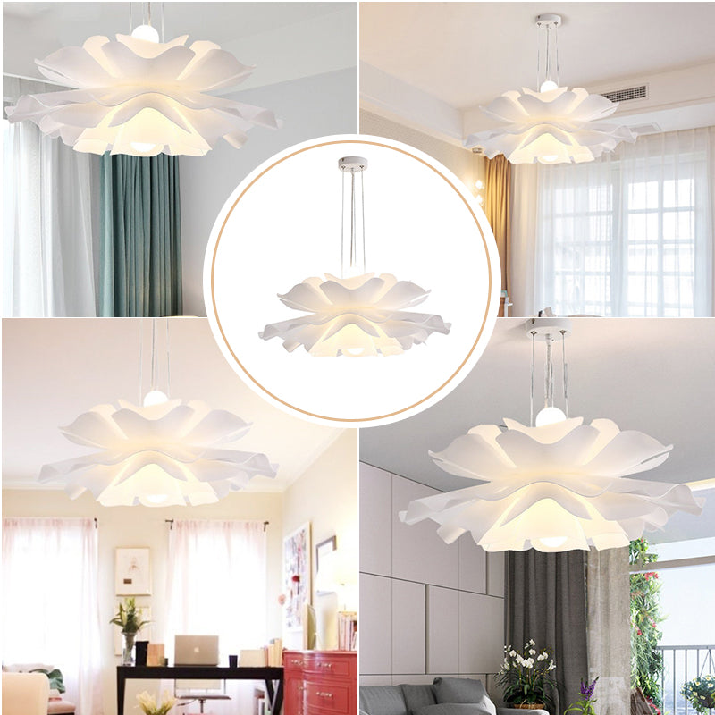 - This charming white flower pendant light managed to combine practicality with elegance. And the design of this product is overall more modern. When lit, lighting diffuses from the acrylic shade to cast a romantic ambiance.